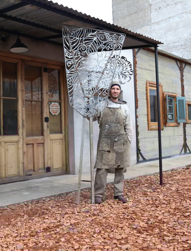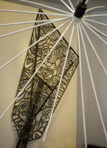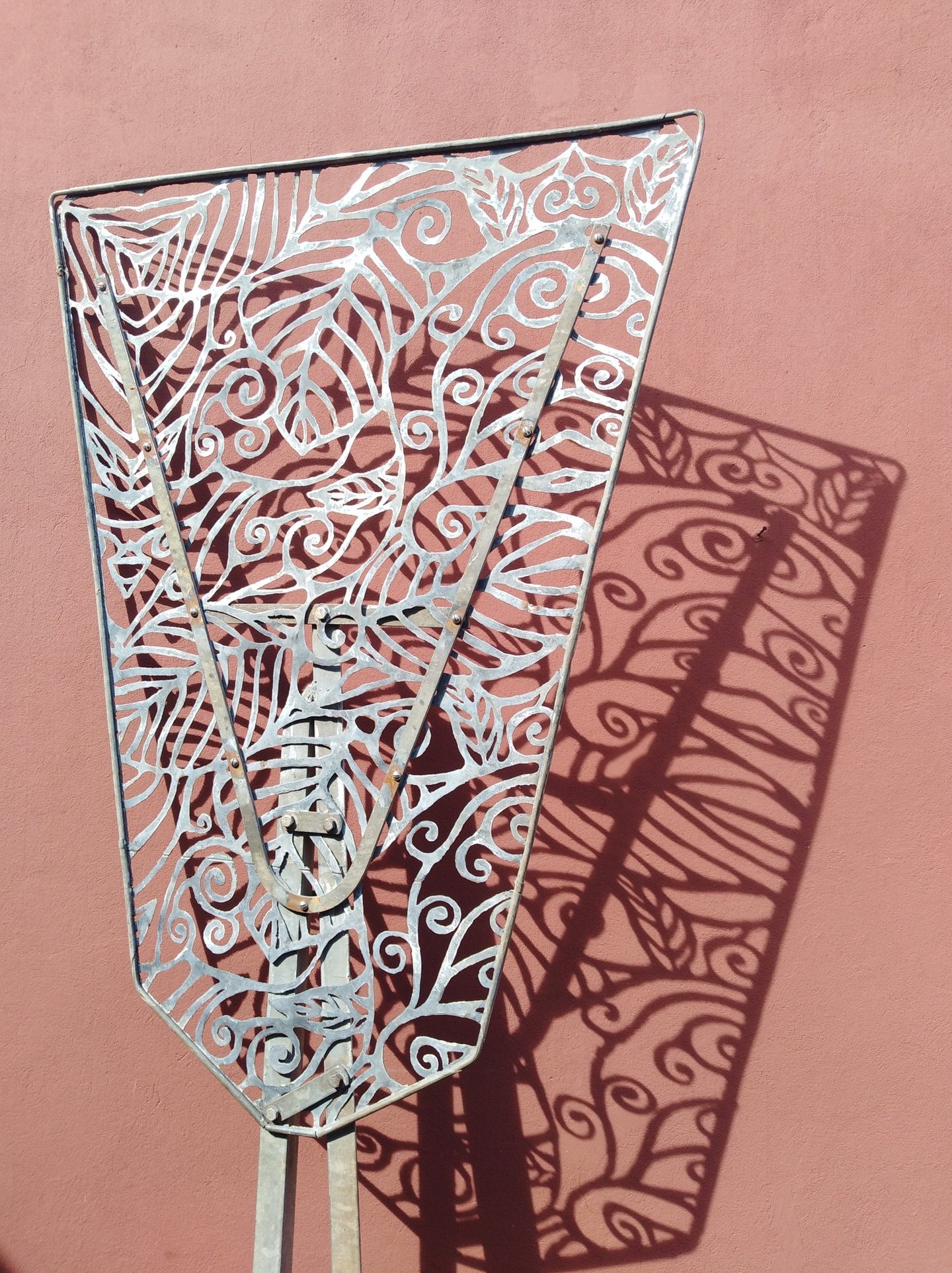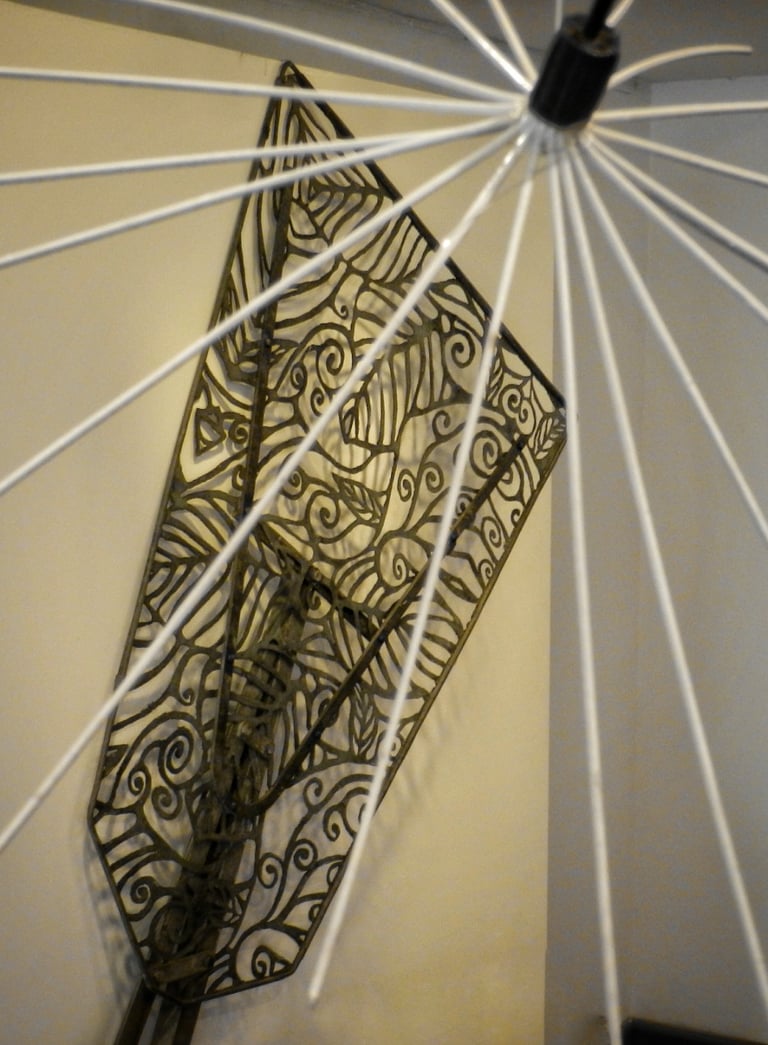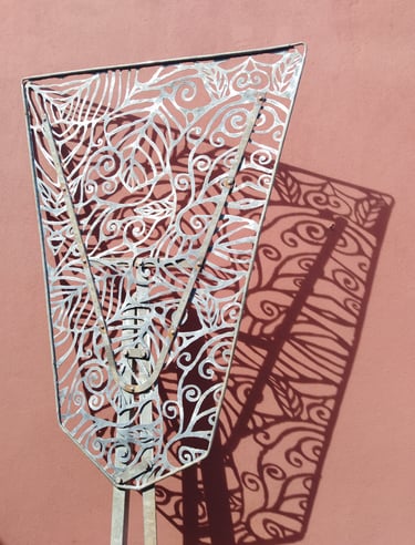 La obra es una cola de molino calada con un dibujo abstracto que evoca la naturaleza. Con un dejo de hojas de plantas que se dejan entrever, el artista ha creado una pieza que parece fluir como el viento a través de los campos. La obra es una muestra de la capacidad del arte para capturar la belleza natural y la elegancia de la forma en un objeto cotidiano.
