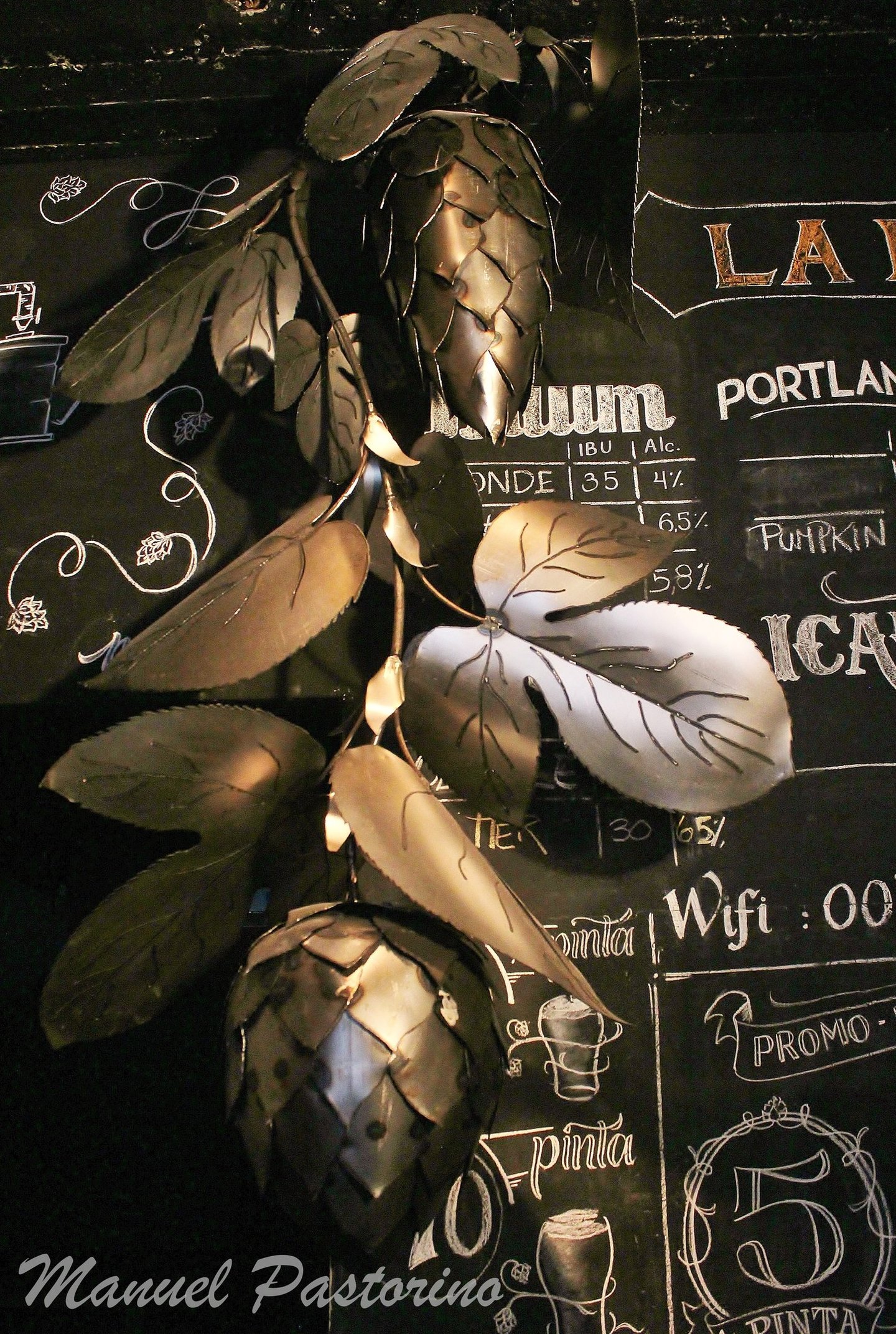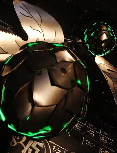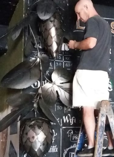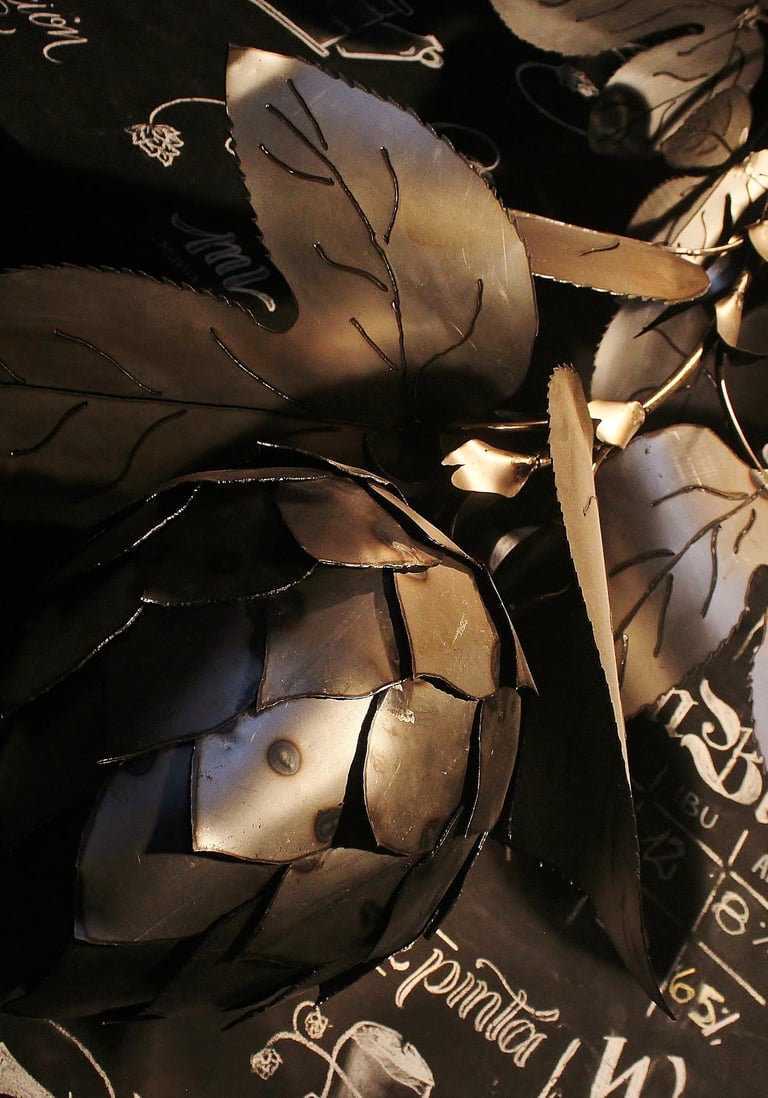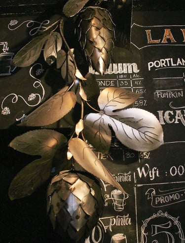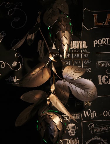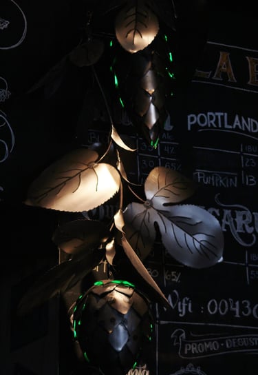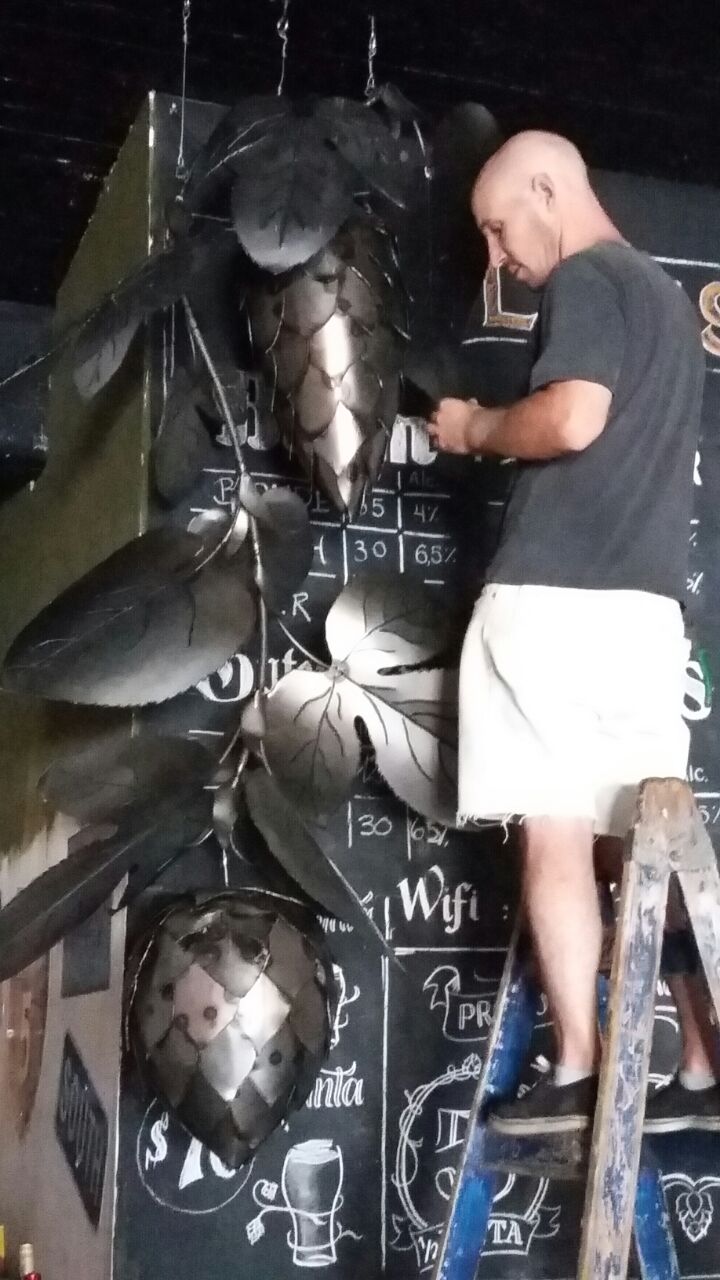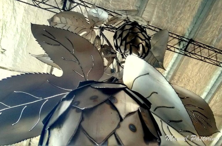 Obra de 2,5 m de altura realizada en hierro, mediante la técnica de calado y moldeado, con detalles y diseños originales. Lúpulo es un trabajo artístico que busca homenajear al mundo natural y, a su vez, promover conciencia sobre su sobreexplotación.
