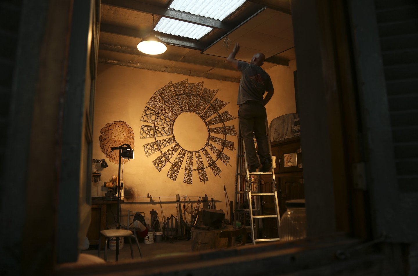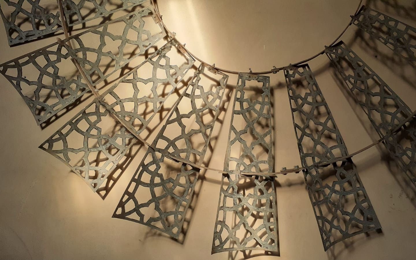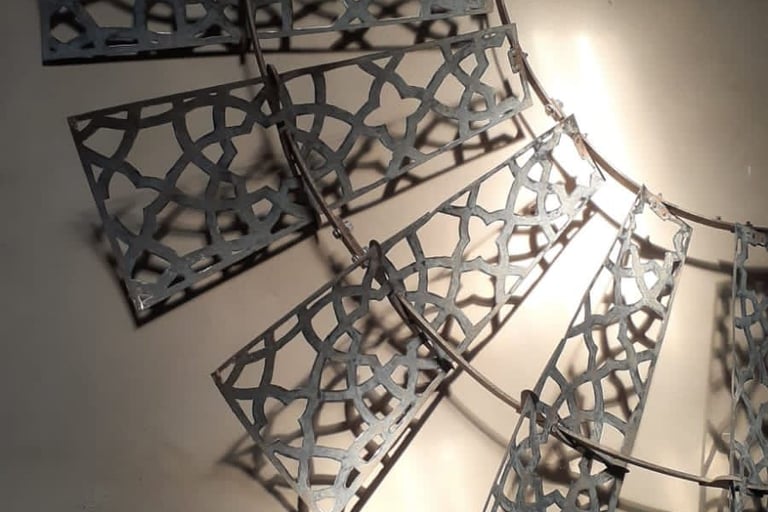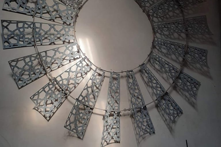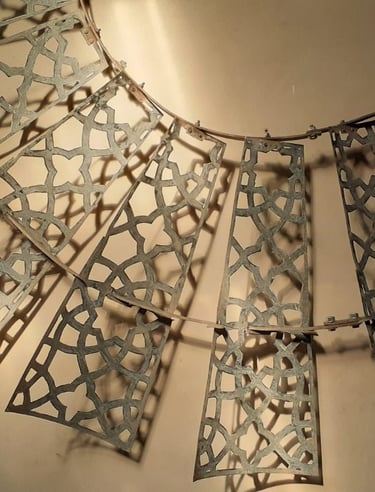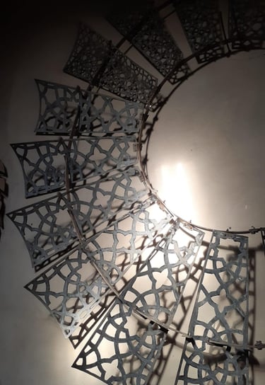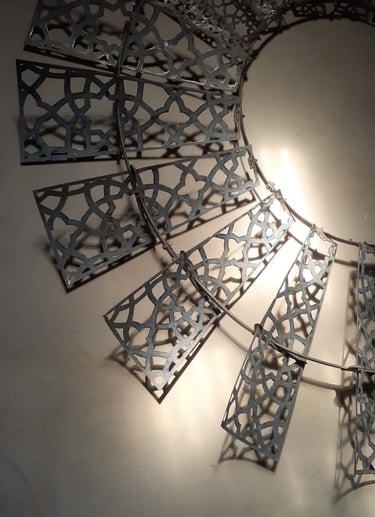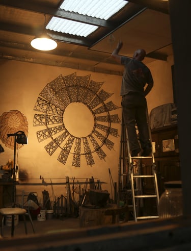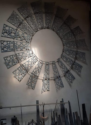 Esta obra de 2.5 m de diámetro busca darle una nueva belleza y valor a un objeto cotidiano de nuestras pampas: el molino de viento. Con una técnica de calado y patrones abstractos, se busca una resignificación que permita al público apreciarlo desde una mirada artística, más allá de su función productiva como hilo conductor entre el viento y el agua.