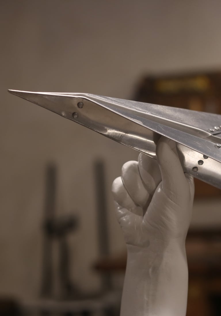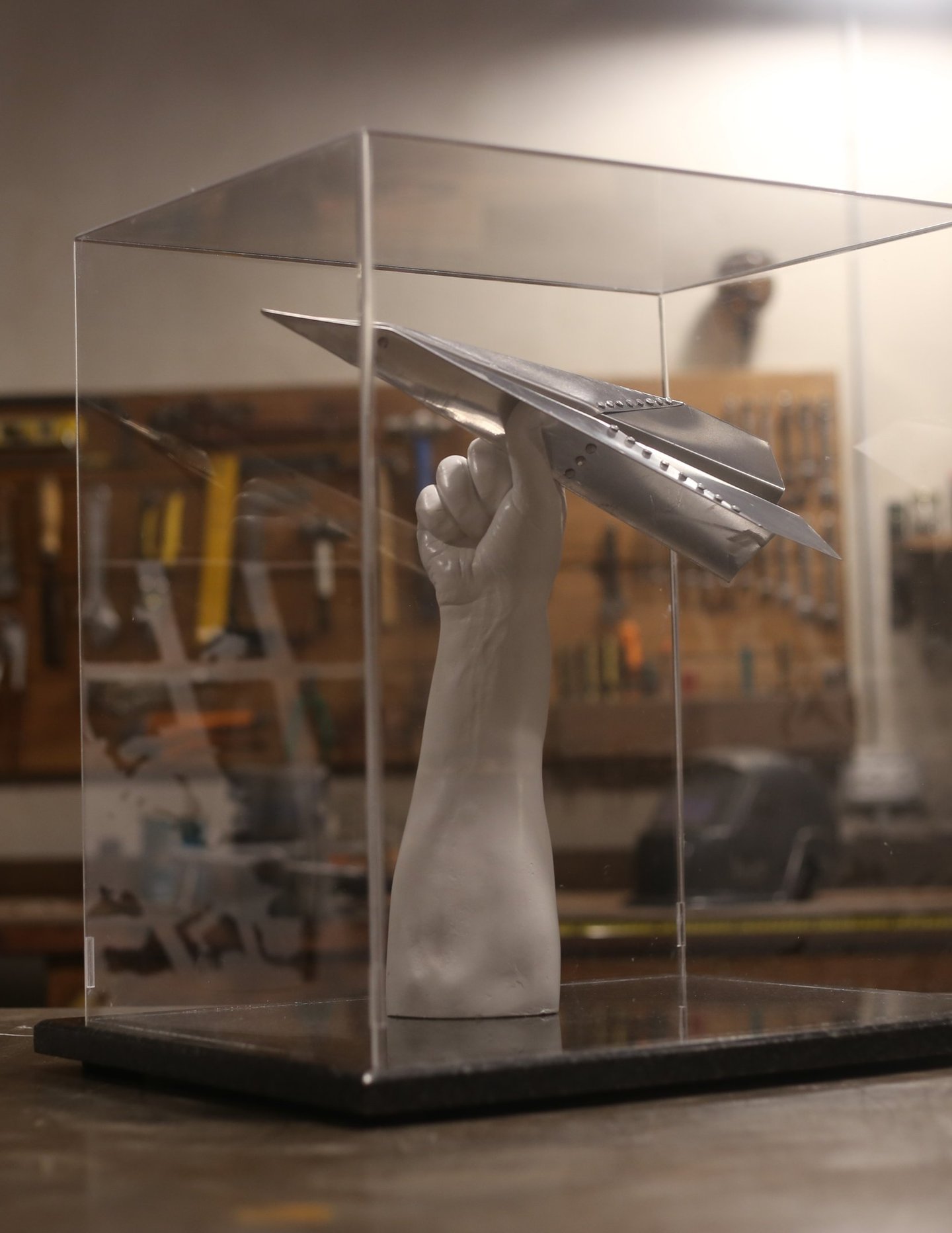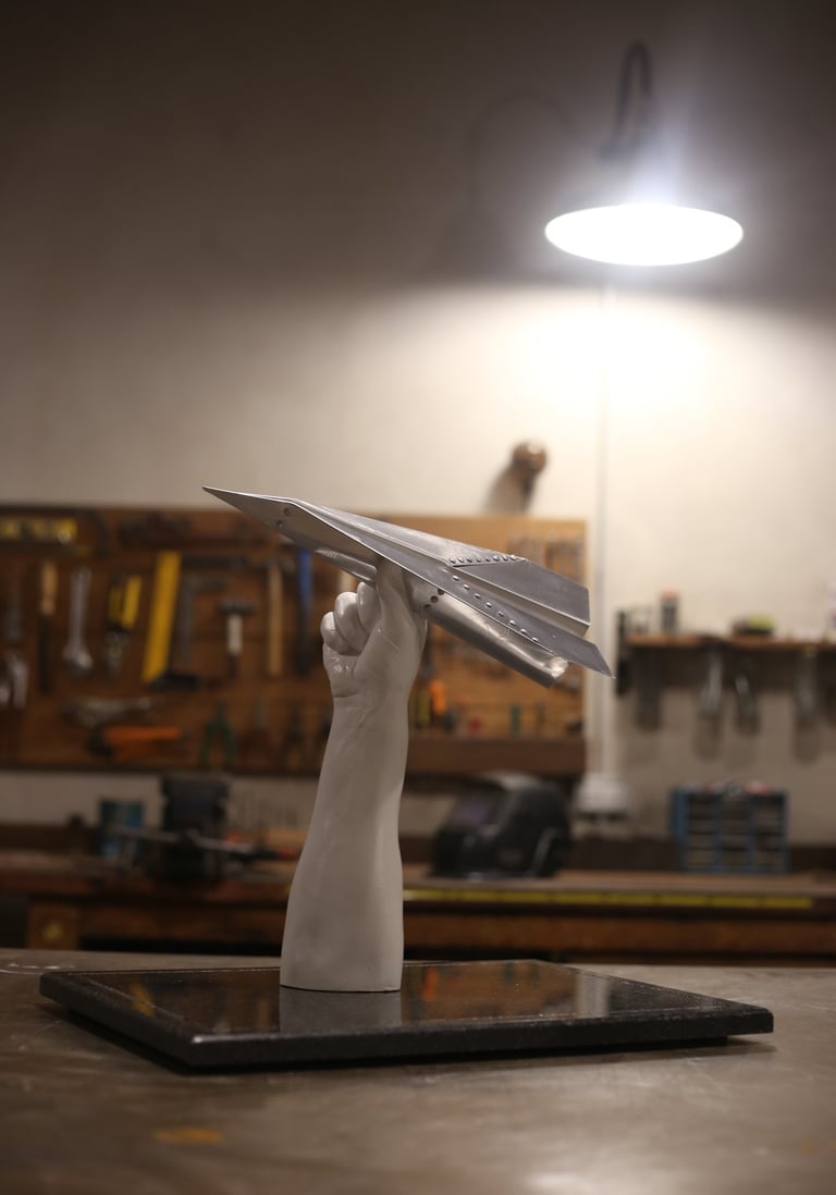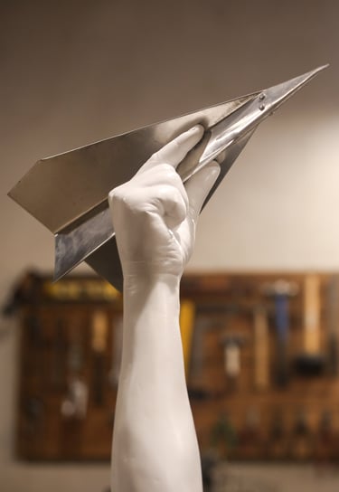 Escultura de pequeñas dimensiones realizada en aluminio y yeso, creada como homenaje a los pioneros de la aviación de Balcarce. El avión de papel simboliza la inocencia, la imaginación y la fascinación más genuinas, que se manifiestan en la niñez, y se transforman en nuestras “primeras horas de vuelo”.